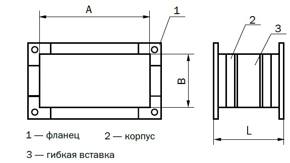 Вставки гибкие представляют собой конструкцию, состоящую из двух фланцев, соединенных между собой изолирующим материалом. Фланцы гибких вставок изготавливаются из шины специального профиля из оцинкованной стали толщиной 1 мм.