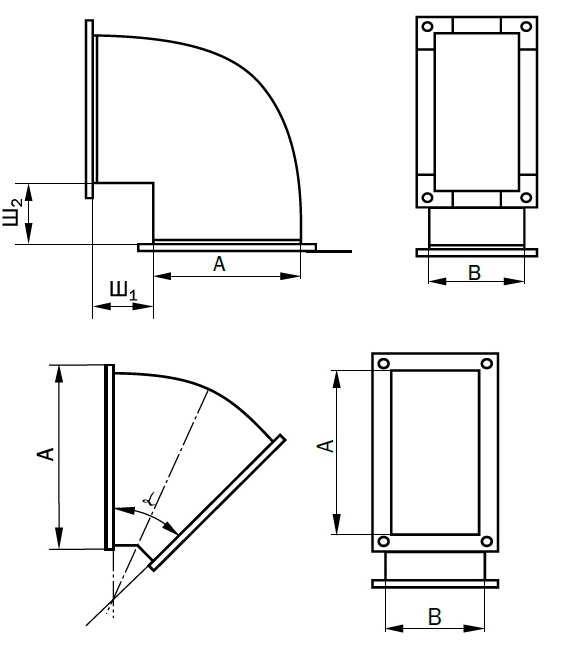 Размер боковой (поворотной) стороны А записывается первым. Шейки отвода могут отличаться от типовых. В примечании указываются Ш1 и Ш2. По умолчанию Ш1=Ш2=100 мм. Размер боковой (поворотной) стороны записывается первым (А). α = 45o, по желанию заказчика может быть 15o, 30o, 60o, 75o.